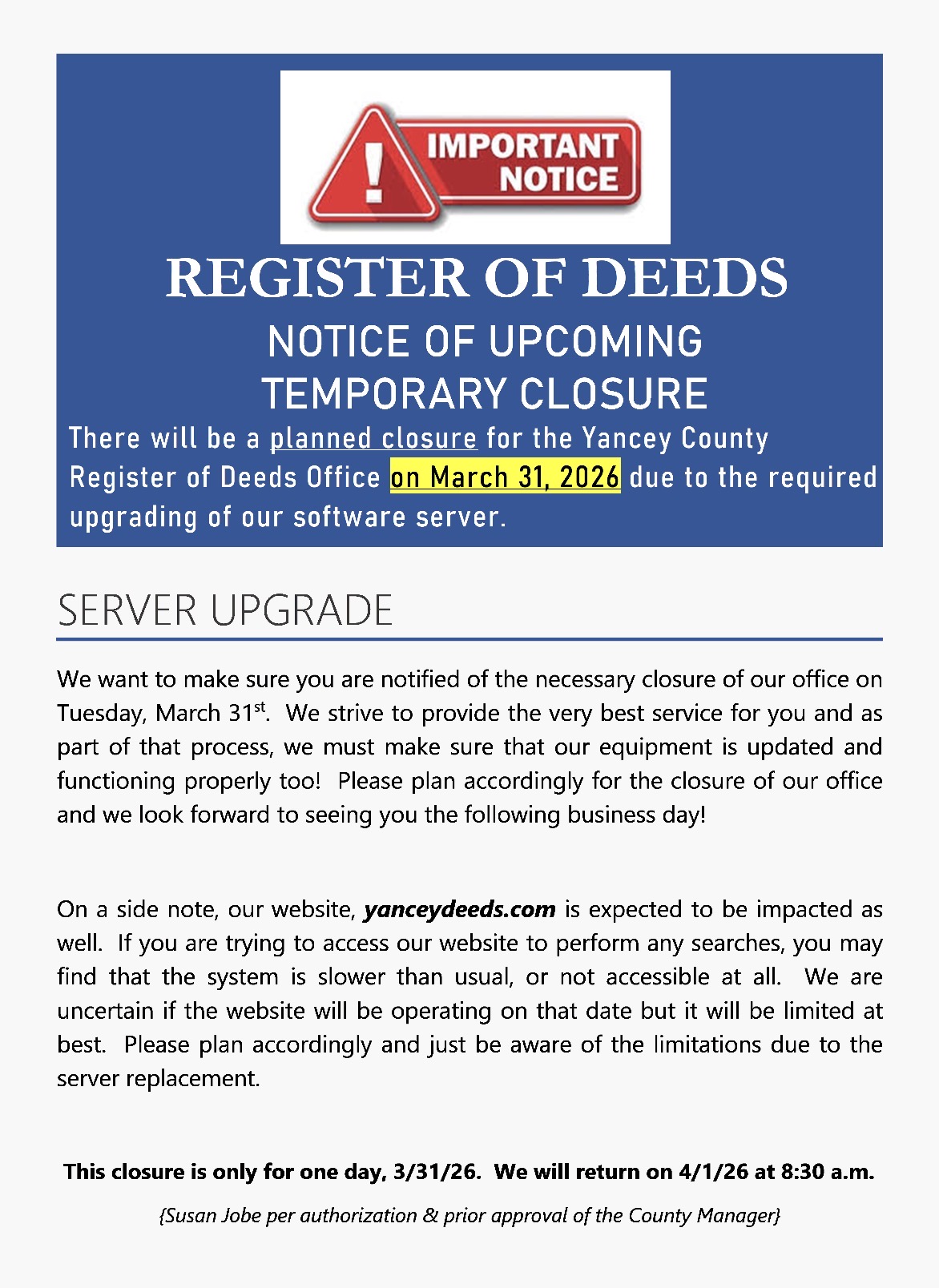 The Register also issues marriage licenses and administers the oath of office to notaries public. As a service to Yancey County citizens, the Register of Deeds records and keeps copies of all documents pertaining to land and issues certified copies or photocopies of same, as required.